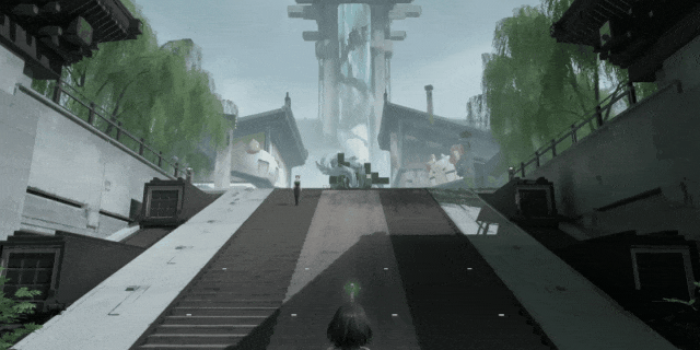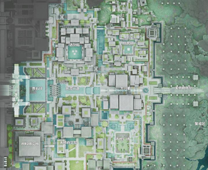 从轴线西侧往东侧迈入城市,两侧依次以生活功能为主的居民区和市民广场,以行政功能为主的选剑局和天师府学院,轴线上则有作为商业中心的方兴衢。城市区域按照功能进行了严密划分,这种布局风格和中国古代都城如出一辙。虽然城市风貌表现出了科技感、现代感,但玩家在武陵城中漫步时,仍能从潜意识中感受到城市所散发出的秩序感。